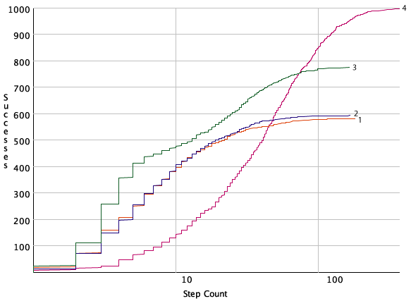 By looking at the graph, you can see that Algorithm 3 can often solve the problem in its first four or five steps, after which it is not as effective. This may lead you to try to suggest using Algorithm 3 with a random restart after five steps and this does, indeed, dominate all of the algorithms for this problem instance, at least in the number of steps (counting a restart as a single step). However, because the random restart is an expensive operation, this algorithm may not be the most efficient. This also does not necessarily predict how well the algorithm will work in other problem instances.