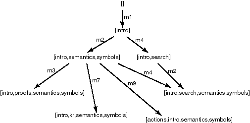 The simplest is h(n) is the number of topics in g that are not in n. This isn't quite right, as one module (module m2) covers two topics. So we should divide this number by two or somehow make sure we don't count both semantics and symbols. This would then be an underestimate of the number of topics that needs to be taught.