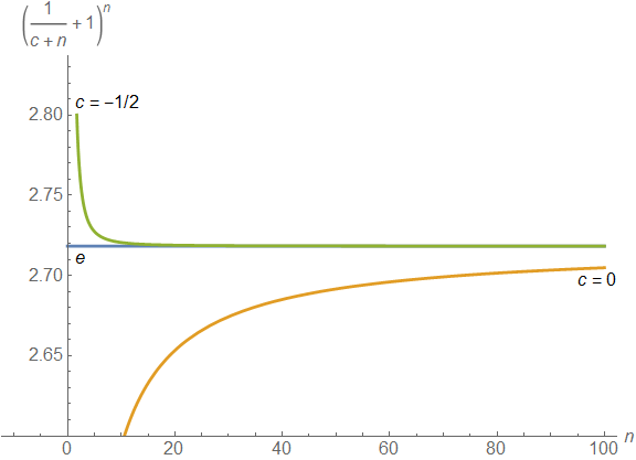 Remember Euler’s number, $e=2.71828$… ? One of the Bernoulli boys showed that it’s the limit of $(1 + 1/n)^n$ as $n$ goes to infinity. But if $n$ goes to infinity then we should be able to add an arbitrary constant $c$ to the denominator without changing the result. So, more generally,