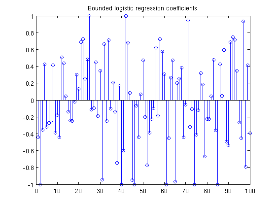 y = sign(y); funObj = @(w)LogisticLoss(w,X,y); LB = -ones(nVars,1); UB = ones(nVars,1); fprintf('Solving bounded logistic regression problem...\n'); w = minConf_TMP(funObj,zeros(nVars,1),LB,UB); stem(w);title('Bounded logistic regression coefficients'); pause