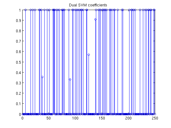% Generate data nInstances = 250; [X,y] = makeData('classificationNonlinear',nInstances,2,2); sigma = 1; K = kernelRBF(X,X,sigma); A = diag(y)*K*diag(y); C = 1; funObj = @(alpha)dualSVMLoss_noBias(alpha,A,y); LB = zeros(nInstances,1); UB = C*ones(nInstances,1); fprintf('Solving dual SVM problem (no bias)...\n'); alpha = minConf_TMP(funObj,zeros(nInstances,1),LB,UB); stem(alpha);title('Dual SVM coefficients'); yhat = sign(sum((diag(alpha.*y)*K)))'; trainErr = sum(yhat~=y)/numel(y) pause