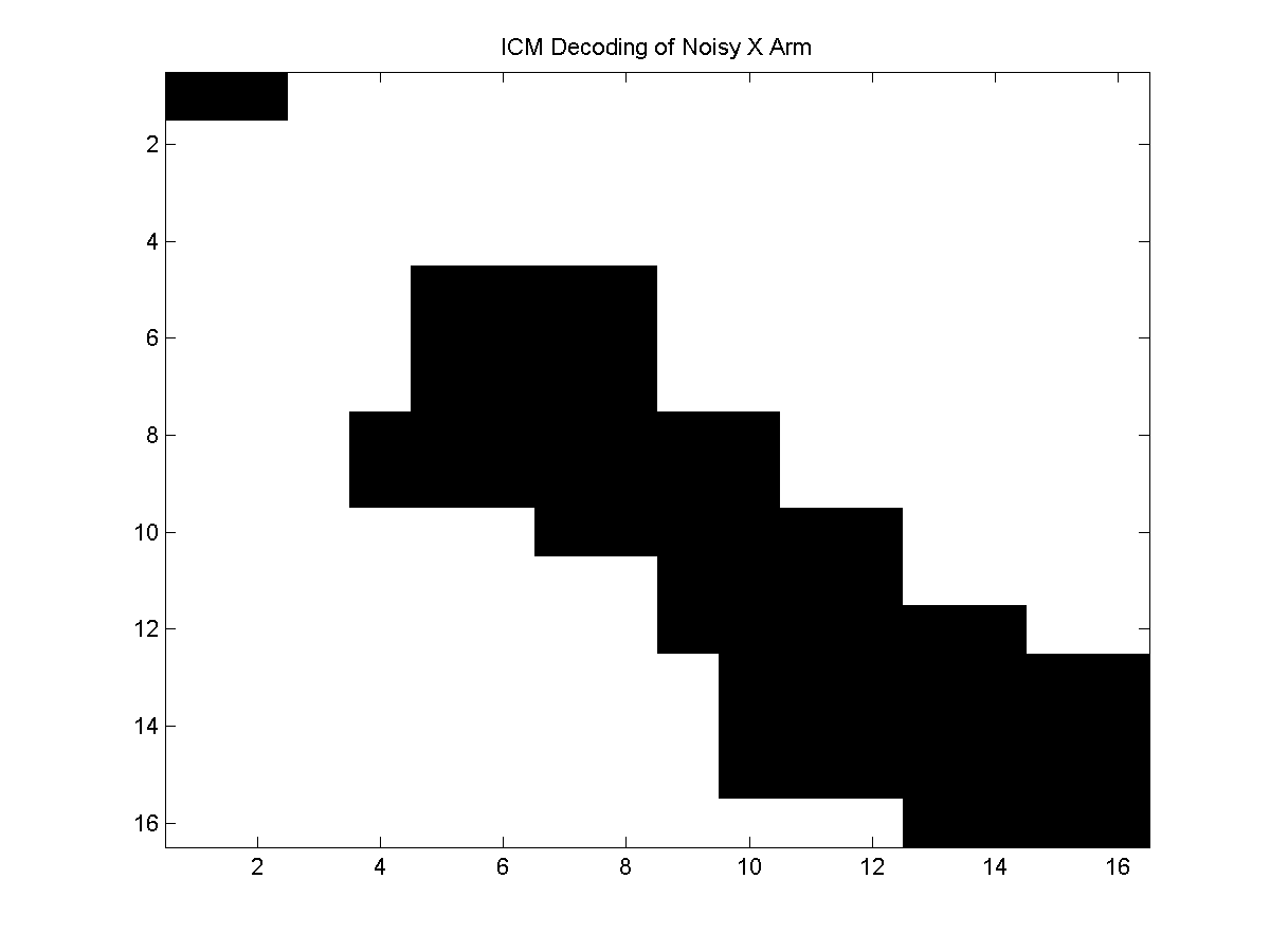 My implementations of the integer/linear programming methods run out of memory if applied to the full noisy X problem. Below, we plot the results of ICM and the integer/linear programming methods applied to one quadrant of the noisy X problem: