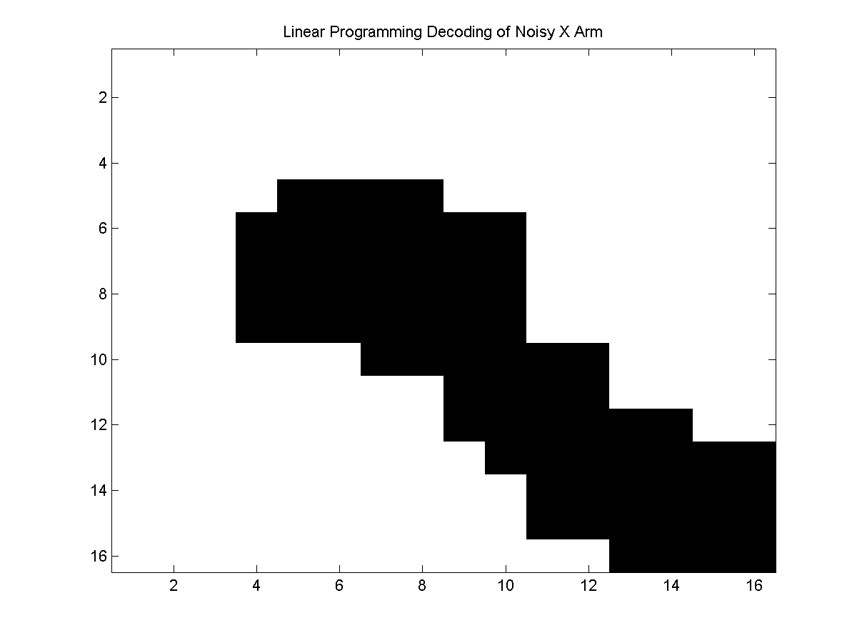 The problem of computing the optimal decoding can be formulated as a binary integer linear program, and solving this integer program will yield the optimal decoding. Unfortunately, solving integer programs is NP-hard, so I've included the integer programming formulation among the approximate methods because we have no idea how long an integer programming method will take to compute the optimal decoding. For example, below we compute the optimal decoding for problems with 256 nodes using integer programming, but there are problems with 50 nodes that will not be solved in a reasonable amount of time with this technique. After discussing the binary integer linear programming method, we then turn to a linear programming relaxation of this method. Here, we remove the restriction that the solution is integral, leading to a linear program that can be solved in polynomial time to give an approximate decoding.