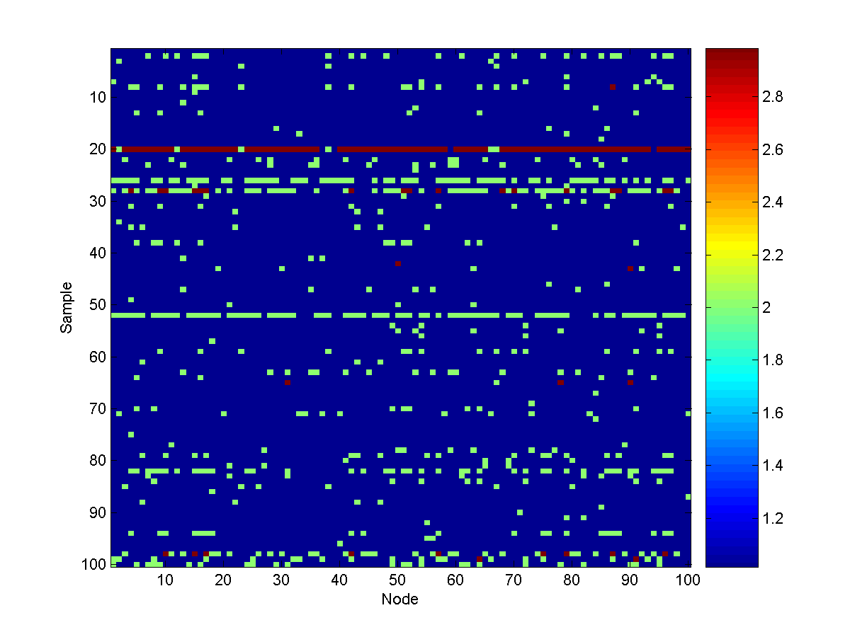 edgeStruct.maxIter = 100; samples = UGM_Sample_Tree(nodePot,edgePot,edgeStruct);Here is a visualization of 100 samples: