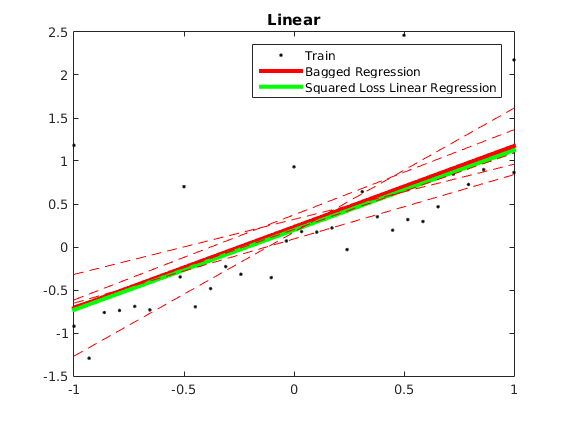 Demonstrates bagged mean regression and linear regression models. Red dashed lines are predictions from individual models trained on bootstrap samples of the dataset.