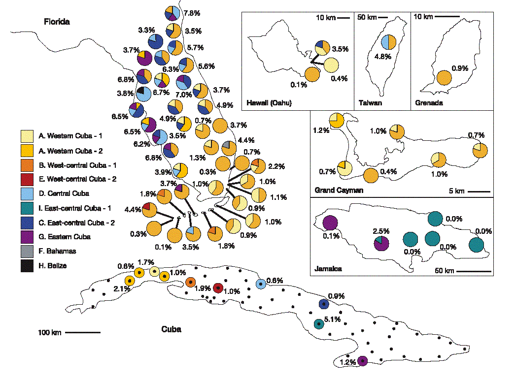 Description: This image shows the sources of genetic variation in introduced populations of a certain species of lizards, A. sagrei. The populations were introduced in Florida, Hawaii, Taiwan, Grenada, Grand Cayman and Jamaica, and the source populations came from populations native to various locations in Cuba. The variation in the introduced locations, as well as the local Cuban populations most related to the introduced types, are represented.