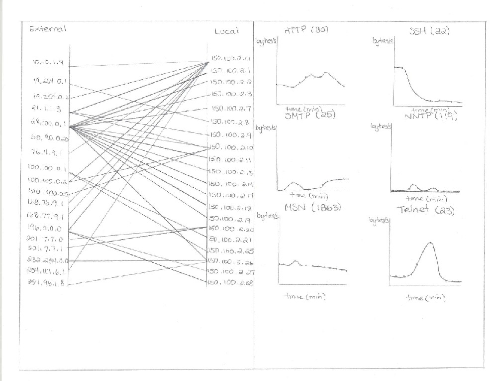 The service based view is based on a trellis of 2D scatterplots or line graphs. Each graph represents a service, x-axis is time and y-axis is bytes/s of traffic. The IP and service based views can be brushed to highlight the corresponding information in either view. For example, if the user click and drags the HTTP line graph onto the IP centric view, the filter on the IP centric view is set to exclude all non-web related connections which vanish until the filter is reset or a different brushing operation takes place. Similarly, dragging an IP from the wall view onto a service graph ties that graph to showing traffic from that specific IP. One scalability enhancement that can be made to this view is to allow portions of the time axis to 'stretch' or 'compress' through user interaction allowing them to gain details on demand. If this proves too problematic the user could be given the ability to 'pan' through the time axis by scrolling left and right on the graph.