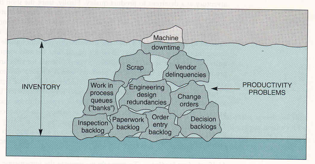 This diagram is from an industrial operations textbook. The diagram provides a visualization of how excess inventory in a business can hide productivity problems. The diagram illustrates a "pond" metaphor where the water level is the level of inventory and productivity problems are represented by rocks. Therefore, it can be seen that higher inventory levels obscure productivity problems.