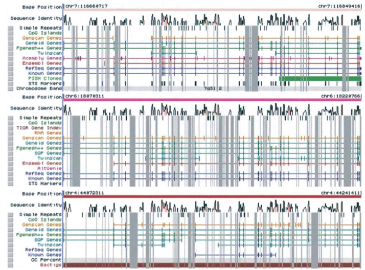 Artemis (Rutherford et al., 2000) and Apollo (Lewis et al., 2002) enable the user to access staggeringly detailed views of a single genome annotation. Apollo (Figure 16) provides more overviews than Artemis, such as depictions of high-level cross-chromosomal comparisons between vertebrate genomes (in this example, human and mouse), while Artemis provides a very detailed view that shows, among other things, all six open reading frames of the genome sequence at the region of interest, line-plots of GC content, hydrophobicity plots, and splicing and SNP patterns (Figure 17). In my (admittedly limited) experience working in genetics wet labs, this information is extremely useful when designing DNA sequence probes or primers that are to interact with the genomic region of interest, and so Artemis can get away with not providing any sort of overview; the intention is that it will only be invoked when a very specific region of interest has been identified.