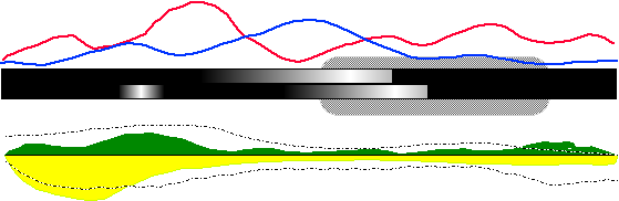 Figure 18 is a mockup of my proposed solution for the first problem. The canonical HIV genome sequence is represented as the thick black bar (with some gradienting that will be discussed in a moment) in the center of the display. Frequency of base substitution is displayed as a line graph overtop the genome 'bar', with the red line representing the immune cohort data and the blue line representing the susceptible cohort data. Frequency of base deletion is encoded as the lightness of the genome bar: The more frequent the deletion, the lighter the bar at that base. The top half of the bar will represent one of the cohorts, while the bottom half of the bar will represent the other. (This has been idealized as a smooth gradient in this diagram, but it the pattern exhibited by the experimental data will probably not be nearly as pretty.) The area/bar chart beneath the genome bar represents the frequency of insertion at a given base position, while the blitted lines plotted overtop represent the average length of those insertions. (Standard deviation from this average may also be a feasible quantity to display on this graph.) The texture of the blitted line prevents the generation of strong visual artifacts when it intersects with the area plots. Finally, regions of interest on the canonical sequence are surrounded with a greyscale rounded box, as in the right side of Figure 18.
