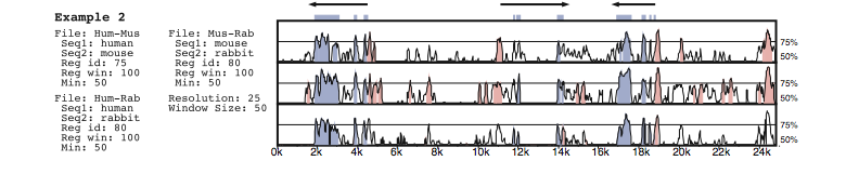 Synplot (Gottgens et al., 2001) is another basic alignment viewer that relies on percent-identity plots (PIPs) to express sequence differences. However, Synplot also explicity represents insertions and deletions as gaps in the lines representing the first or second sequence, respectively. Colour is again used to highlight sequence features, although some spatial encoding is also used to emphasize coding regions (Figure 4).