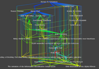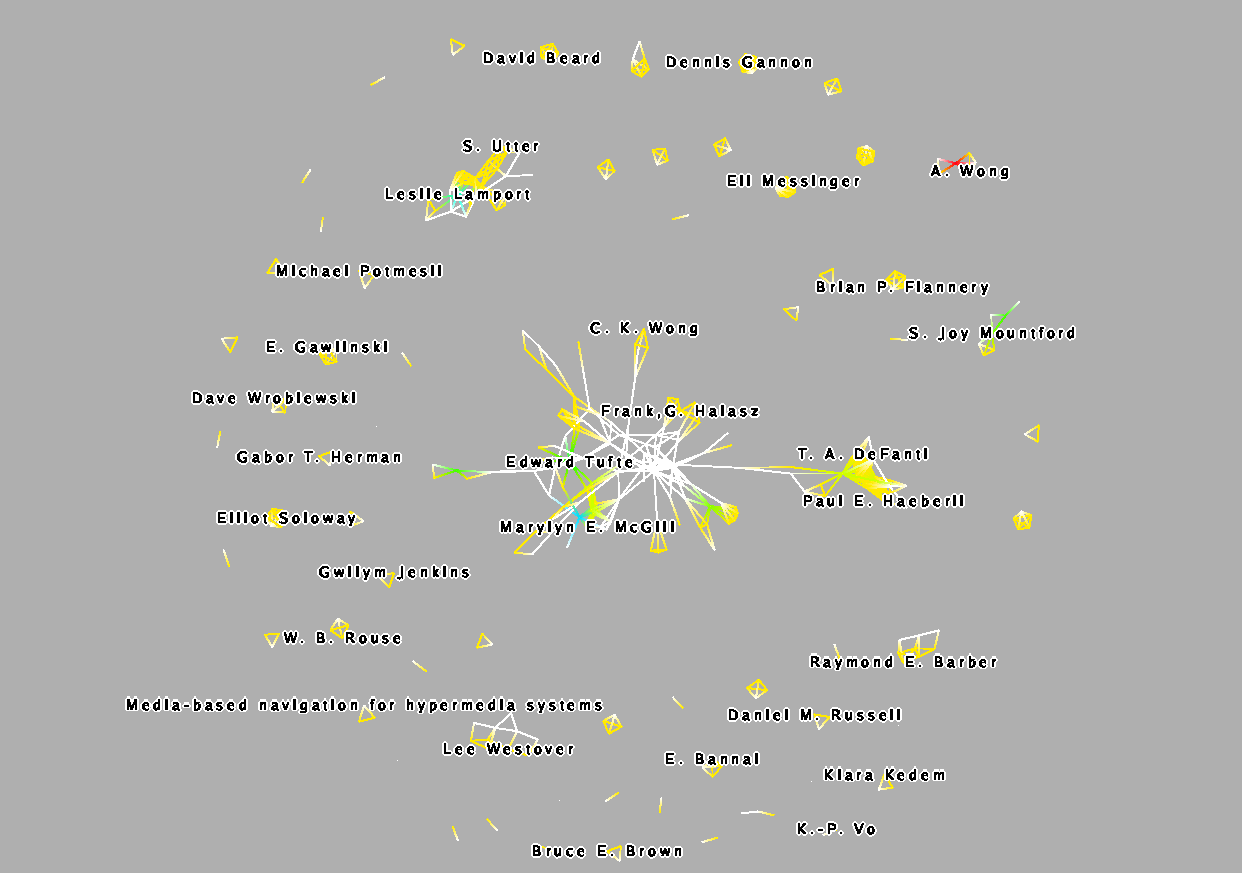 Finally, we select all papers by hitting Control-F for the find panel, choosing the {\it type} property, the {\it =} filter, and the value 0 for papers. We explicitly add Robertson to the selection using the ViewSelection property, and save this whole set to a new subgraph that we name GRCite. We then select the Robertson node again as above, use the Property->Selection->ReachableSubGraph, pick a depth of 2 to find all papers that cite a paper written by Robertson, and save the resulting subgraph using the Edit->New subgraph menu. The final image shows the result of using the Property->Layout->Hierarchical Graph layout. property.