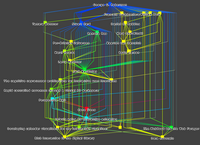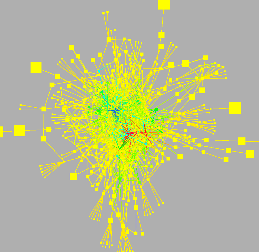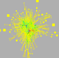 We then select the menu item Property->Selection->ReachableSubGraph, type 1 for the depth into the popup panel and 0 for the direction of the edges (outgoing). We then select the menu item Edit->New subgraph to save this selection for further manipulation, naming it GR.1hop.outgoing. We then select this new subgraph in the hierarchy window, and lay out this subgraph using using a hierarchical drawing algorithm. We can see simply from the drawing which papers were published first, as they are cited by the later ones. The result is shown in the second picture: Robertson has published 11 papers in this database. The coloring by the number of citations shows that Cone Trees is his most influential work. When we consider how Robertson fits into the topics described above in Task 2.4 above, it is clear that he is one of the most central contributors to the Focus+Context topics.