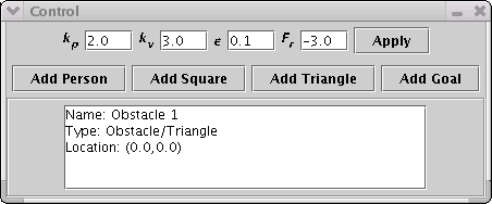 The four fields at the top allow the user to manipulate some global constants that affect the movement of actors. kp and kv are the coefficients of the position error and velocity error for the PD controller. ε (epsilon) is a minimum velocity, required because all movement is controlled by manipulating an acceleration vector. Fr is the repulsion force exerted by obstacles on actors to keep them from colliding, and also is scaled by 'importance' and 'friendliness' factors for interpersonal reactions and goal-directed motion.